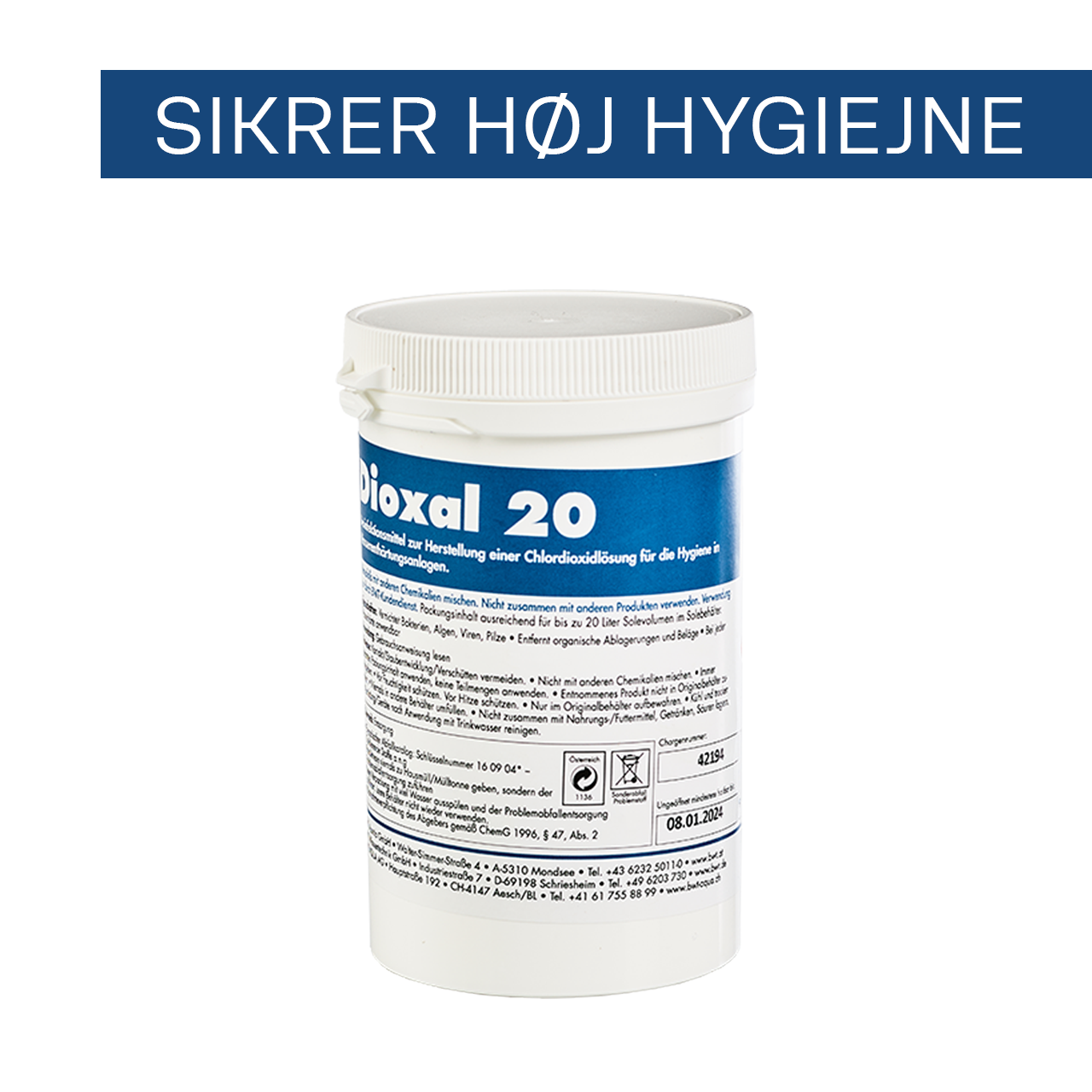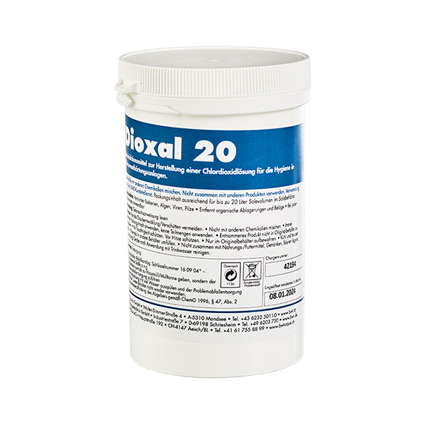 Det er vigtigt, at du opretholder en høj hygiejne i dit blødgøringsanlæg. Derfor har vi udviklet Dioxal, et desinfektionspulver, der fjerner både bakterier, andre mikroorganismer samt biofilm fra ionbyttermassen i dit blødgøringsanlæg. Vi anbefaler, at du renser dit blødgøringsanlæg med Dioxal mindst en gang om året, hvis anlægget har stået stille over længere tid (fx i sommerhuse), hvis anlægget har biofilm i saltkarret eller hvis du oplever en bi-smag i dit BWT vand.