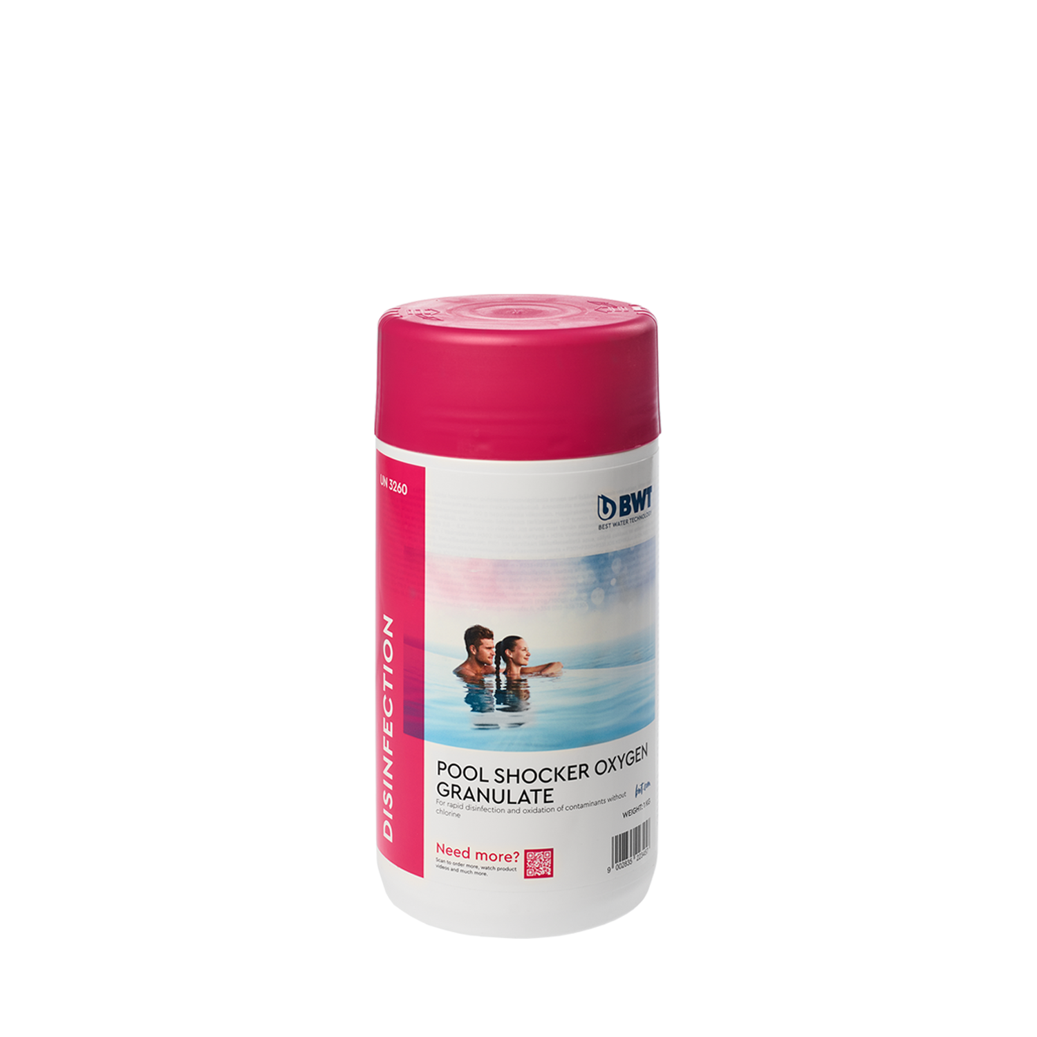Det hurtigvirkende oxygen granulat desinficerer poolvandet og giver mulighed for hurtig genoptagelse af badning efterfølgende.