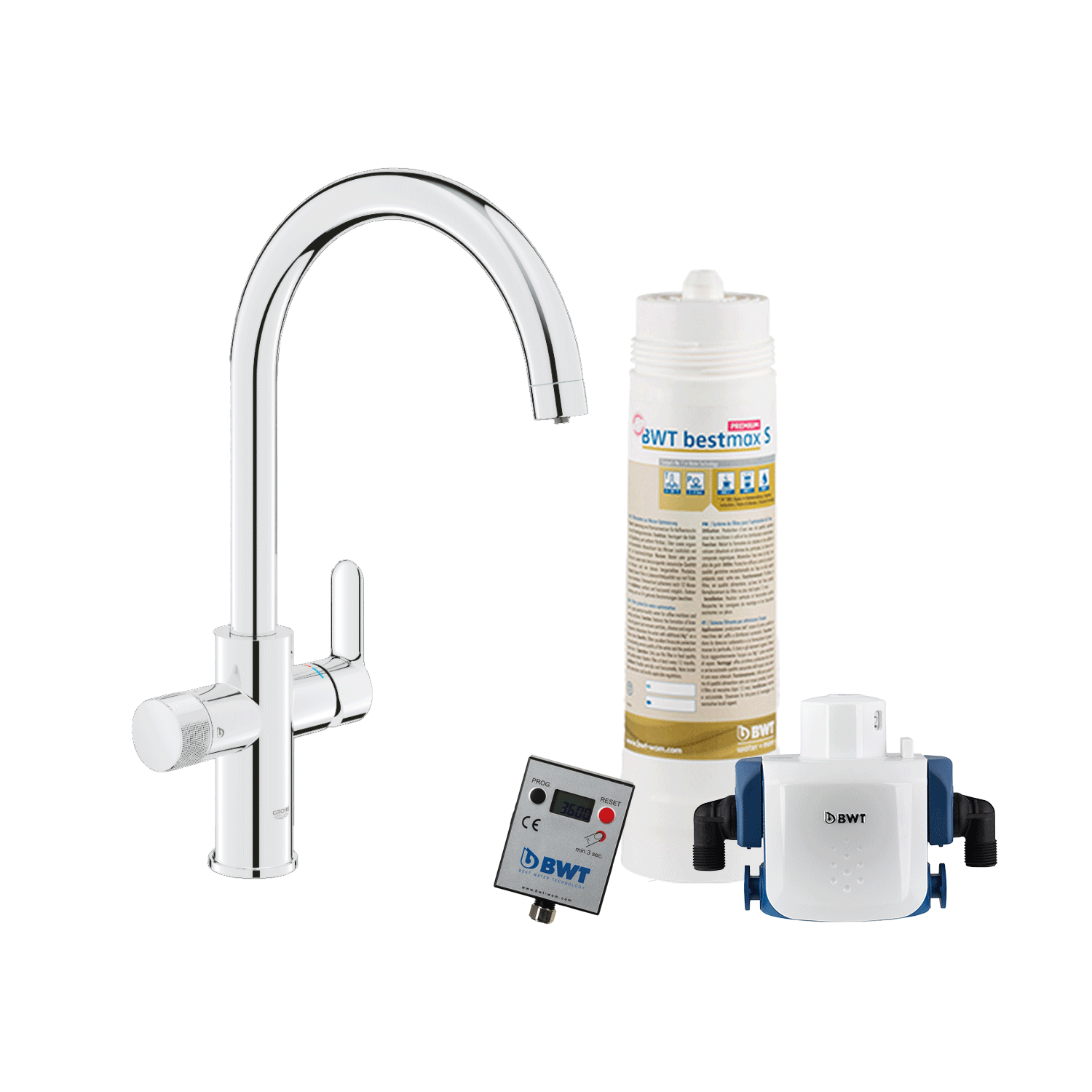 En startpakke indeholder en BWT Barista Home vandhane, installationssæt, flowmåler samt et vandfilter efter eget valg. På den måde får du en komplet løsning, der er klar til installation.