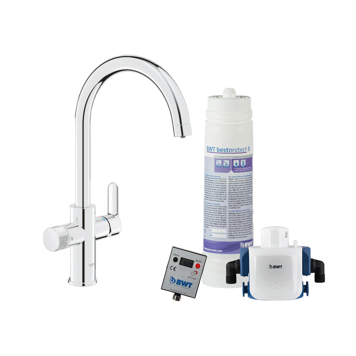 En startpakke indeholder en BWT Barista Home vandhane, installationssæt, flowmåler samt et vandfilter efter eget valg. På den måde får du en komplet løsning, der er klar til installation.