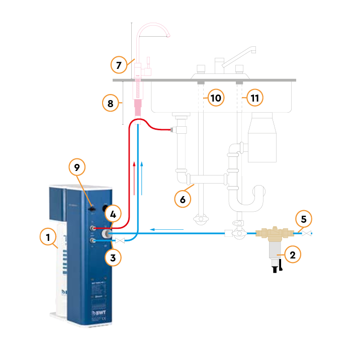 Anlægget leverer op til 1,5 liter filtreret vand i minuttet og producer kun vand, når du skal bruge det. Derfor er en ekstra vandbeholder til filtreret vand ikke nødvendig og du undgår helt risikoen for bakterievækst i eventuel stillestående vand.