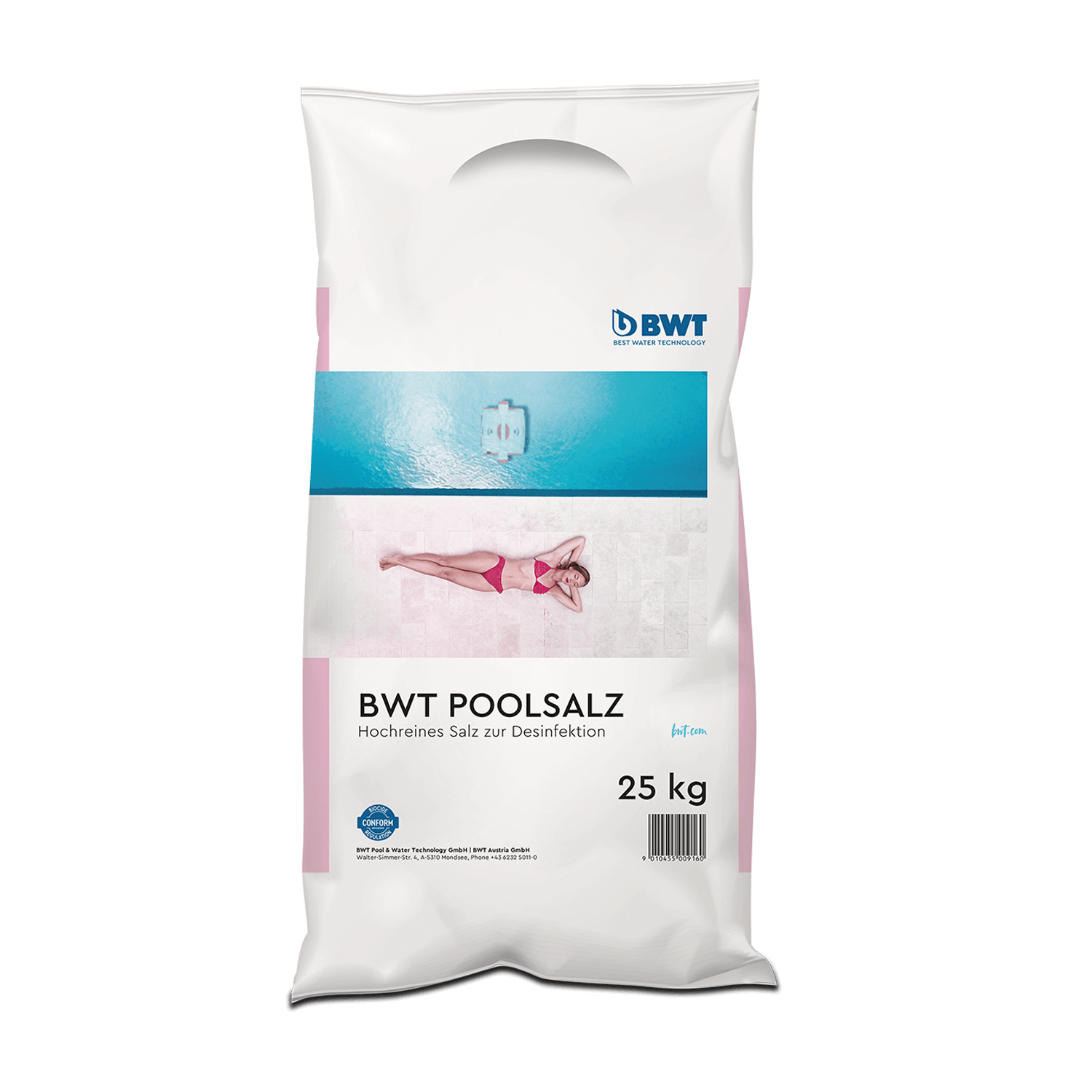 BWT-poolsaltet har en høj renhedsgrad og er hurtigopløsligt. BWT poolsalt kan anvendes sammen med alle almindeligt tilgængelige saltvandsklorinatorer med klorelektrolyse. Den restfrie opløselighed garanterer hygiejnisk rent og klart poolvand.